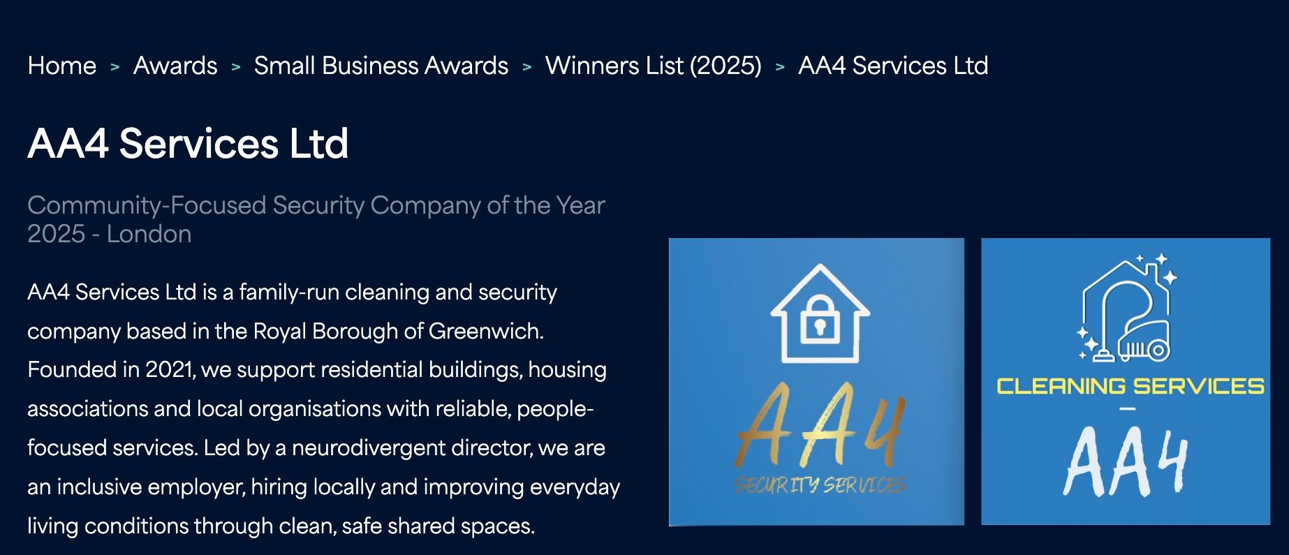 AA4 Services Ltd is an award-recognised employer, shortlisted for the Inclusive Employer Champion Award at the Best of Royal Greenwich Business Awards 2026, sponsored by London South East Colleges.